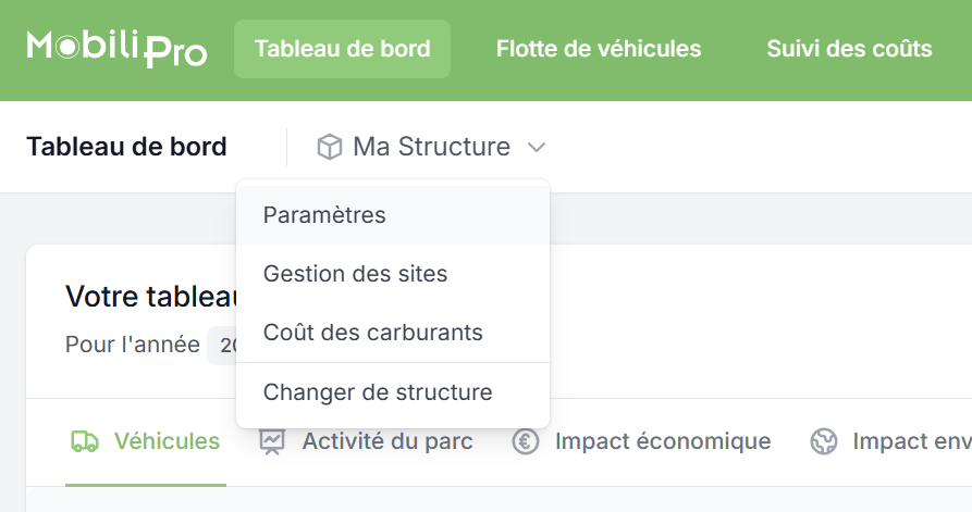 Pour gérer les collaborateur de votre structure, cliquez sur le nom de votre structure en haut de page puis accédez aux paramètres.