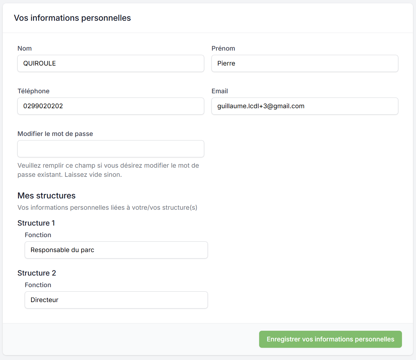 Vous pouvez également modifier votre "Fonction" associée à chaque structure. Il s'agit d'une information purement textuelle qui ne modifiera pas vos droits d'accès cette dernière.