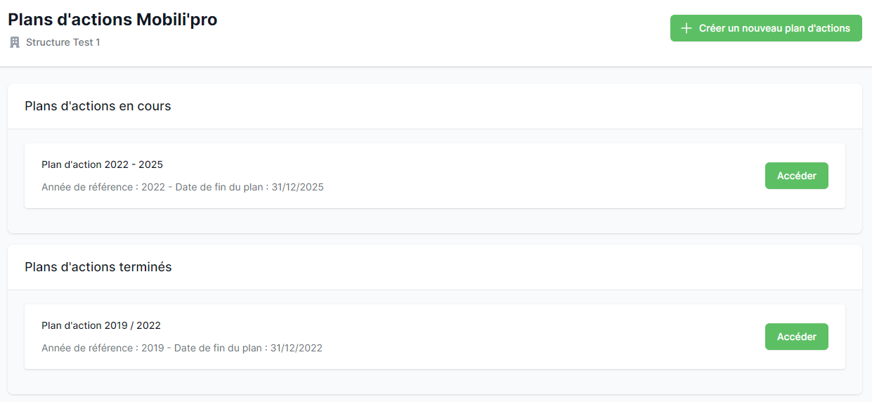 Vous pouvez accéder au détail d’un plan d’action en cliquant sur le bouton “Accéder” à côté de chaque plan d’action listé sur cette page. Un bouton “Créer un nouveau plan d’action” vous permet de créer un nouveau plan d’action.
