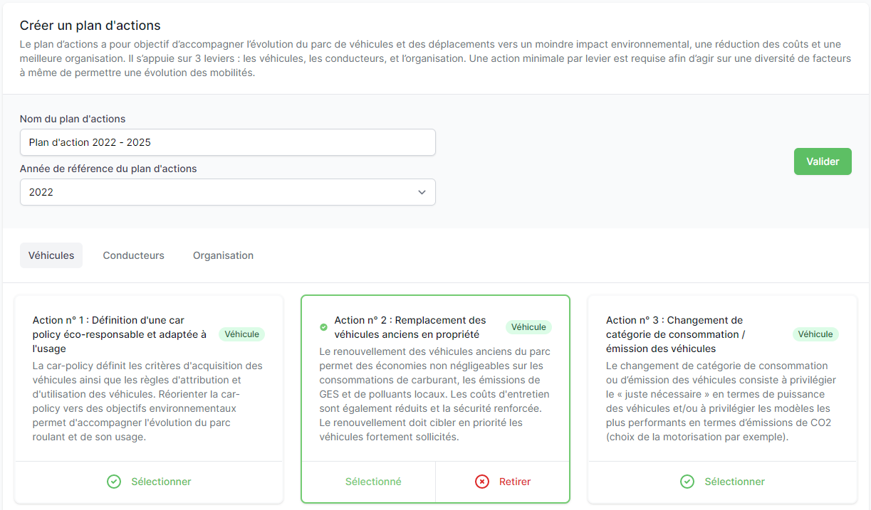 Une fois ces renseignements donnés, il vous faudra sélectionner les actions que vous souhaitez mener parmi les 35 actions proposées par l’outil, répartis en trois onglets :